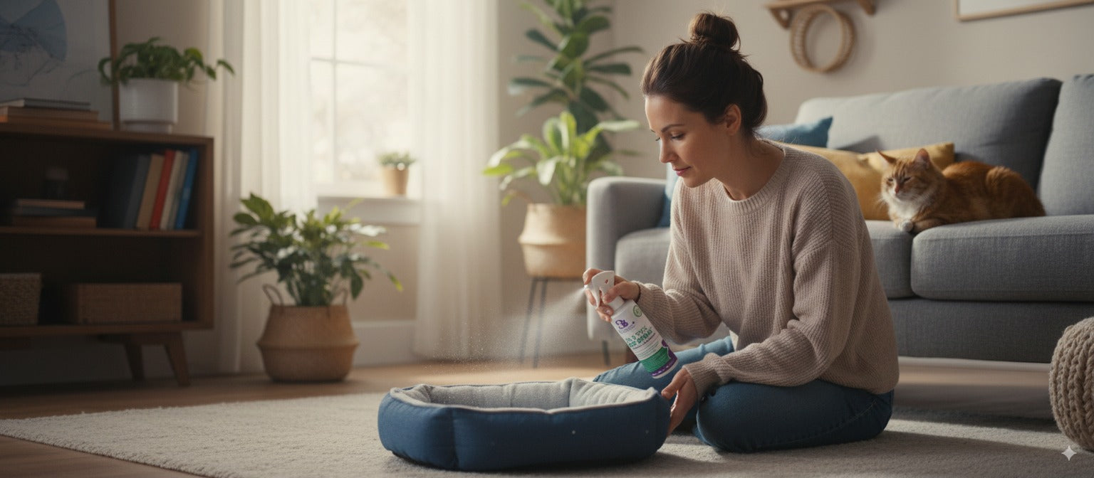 - On Bedding & Furniture: Spray generously on surfaces; allow to dry before pets return.